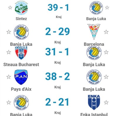 Na koji način je VK „Banja Luka“ predstavljala Grad Banjaluku, Republiku Srpsku i Bosni i Hercegovinu na predkvalifikacionom turniru lige šampiona u Barceloni imali smo priliku vidjeti proteklog vikenda. Porazi od Sintez Kazana 39-1, Barcelone 29 – 2, Steaue 31 – 1, P.A.N – a 38:2 i Istanbula 21:2 su poslijedica svega gore navedenog.