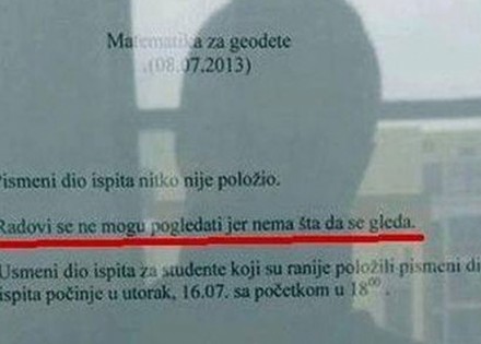 Kako je objavljeno na društvenoj mreži Facebook, čija je vjerodostojnost često upitna, profesor je na listu papira napisao “Radovi se ne mogu pogledati, jer nema šta da se gleda”.