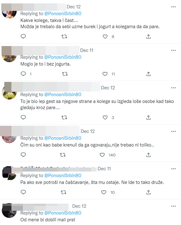 Dalje navodi da je kolege častio “samo burekom i jogurtom”, te se upravo zbog toga pokrenula rasprava u komentarima, gdje su neki misili da je to sramota, dok su drugi tvrdili da nije trebalo ni time da ih počasti.