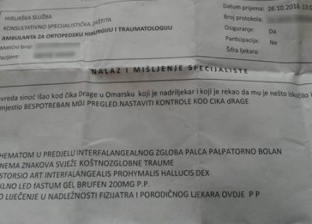 “Sinoć išao kod čika Drage u Omarsku koji je nadrilijekar i koji je rekao da mu je nešto iskočilo i da je namjestio, bespotreban moj pregled. Nastaviti kontrole kod čika Drage”, piše u mišljenju specijaliste.