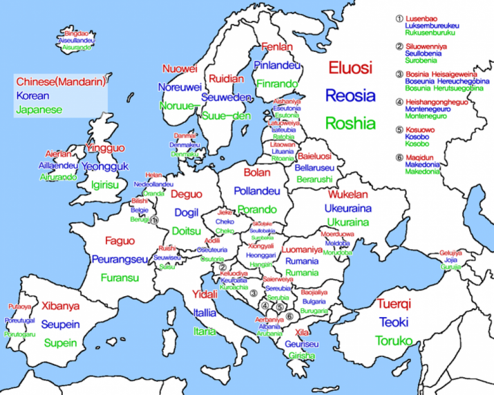 Radi se o jednostavnom grafičkom prikazu evropskih država, s označenim granicama, a umjesto uobičajenih naziva država, one su ispisane onako kako bi ih izgovorili Kinezi, Korejci i Japanci.