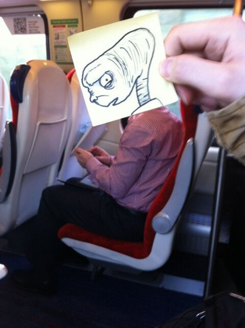 Vožnja vozom ponekad može biti dosadna, ali ne i za animatora Joea Butchera (pseudonim October Jones), koji zna kako da se zabavi. Butcher je na malim papirima crtao različite likove, a potom ih fotografisao tako da se čini kao da su dio tijela pojedinih putnika.