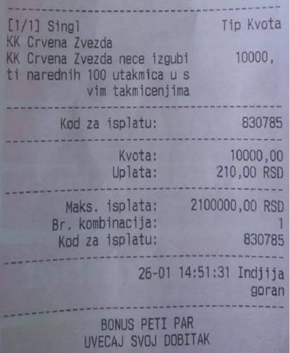 Navijače Zvezde su fantastični rezultati bacili u trans, a jedan od njih je odlučio i da odigra gotovo nevjerovatan listić. Naime, on se kladio da Crvena Zvezda neće izgubiti u narednih 100 utakmica!. Na ovu opkladu odlučio je uložiti 5 KM, a eventualni dobitak iznosi oko 50.000 KM.