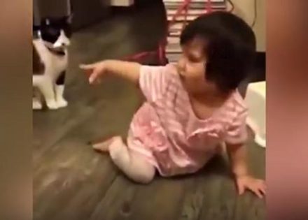 Djevojčica stara oko dvije godine u kući trpi teror i to od svoje mačke! Crno-bijela maca djeluje krajnje mirno i umiljato, ali, po svemu sudeći beba joj smeta.