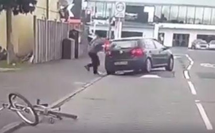 Vozač automobila VW golf je iz nepoznatog razloga namjerno naletio na biciklistu koji je vozio trotoarom. Biciklista prvo je pokušao da izbjegne udarac, ali je ipak preletio preko automobila, poslije čega je pojurio za njim i razbio mu zadnje staklo iz osvete.