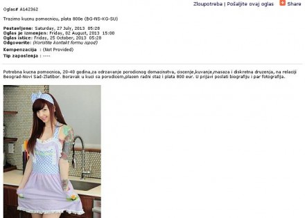 Evo kako je sve to opisao oglašivač: “Potrebna kućna pomoćnica, 20-40 godina, za održavanje porodičnog domaćinstva, čišćenje, kuhanje, masaža i diskretna druženja, na relaciji Beograd-Novi Sad-Zlatibor. Boravak u kući sa porodicom, plaćen radni staž i plata 800 eura. U prijavi poslati biografiju i par fotografija.”