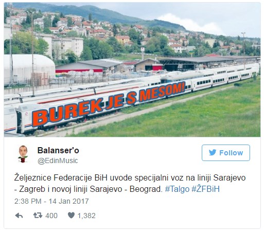 Jedna od šala koja je privukla posebnu pažnju došla je iz Bosne i Hercegovine. Na vozu koji je „krenuo“ iz Sarajeva ka Beogradu i Zagrebu ispisana je „važna“poruka.
