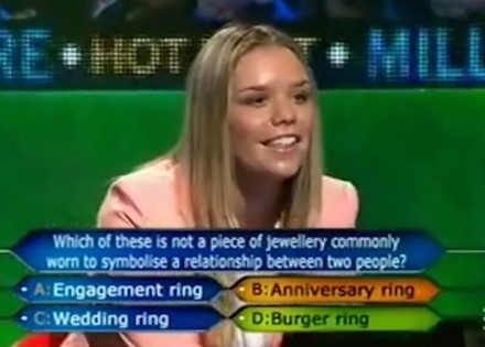 Njeno pitanje je glasilo “Koji od ovih prstenova ne označava vezu između dvoje ljudi?”. Djevojka je odgovorila da je to prsten “godišnjice”, a tačan odgovor je prsten iz smokija nazvan “burger ring” i tu završila takmičenje.