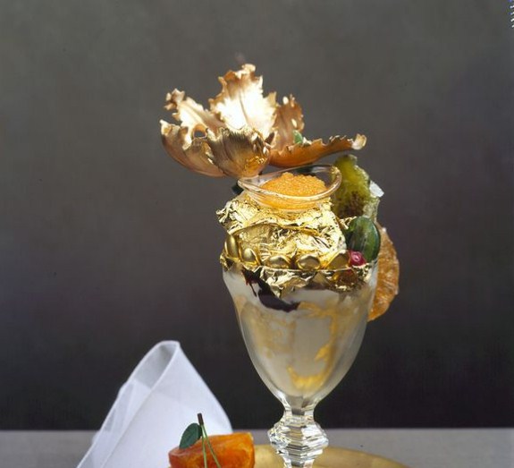 Jelo se služi u čaši od kristala Bakarat od 350 dolara (obloženo sa više listića od 23 karatnog zlata), sa kašikom od 18 karatnog zlata.