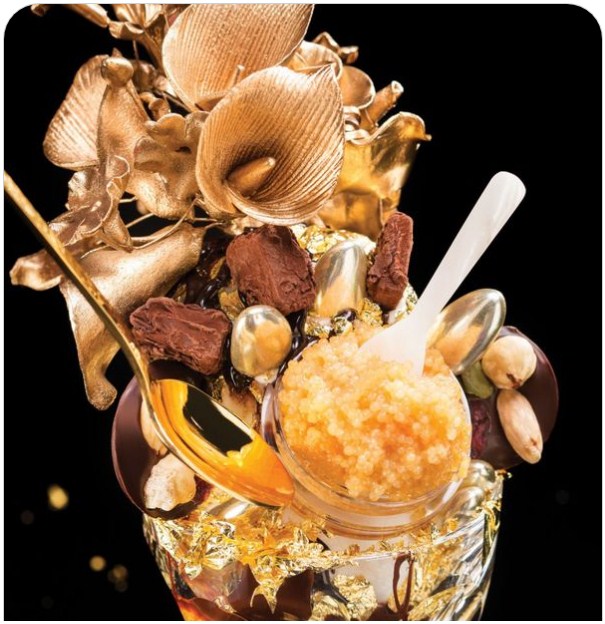 Poslastica, koja se mora naručiti najmanje 48 sati ranije, dolazi u kompletu sa tri kuglice tahitijskog sladoleda od vanile prekrivenih listićima zlata od 23 karata, kao i bademima, kavijarom i orhidejama od zlata koje se prave osam sati, kandiranim voćem iz Pariza.