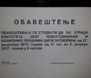 Obavještavaju se studenti da će zgrada fakulteta zbog novogodišnjih i božićnih praznika biti zatvorena od 27. decembra od 21 čas do 8. januara 2017. godine u 6 časova – piše u obaviještenju koje je zalijepljeno na vrata ove ustanove.