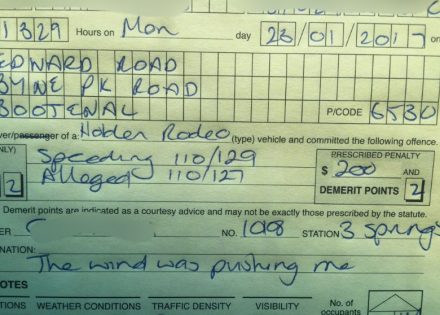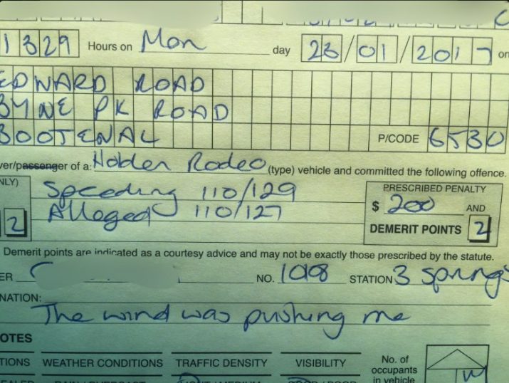 Ipak, Australijancu koji je vozio brzinom od 129 kilometara na sat (19 kilometara na čas više od maksimalne dozvoljene brzine), treba skinuti kapu za originalnost.