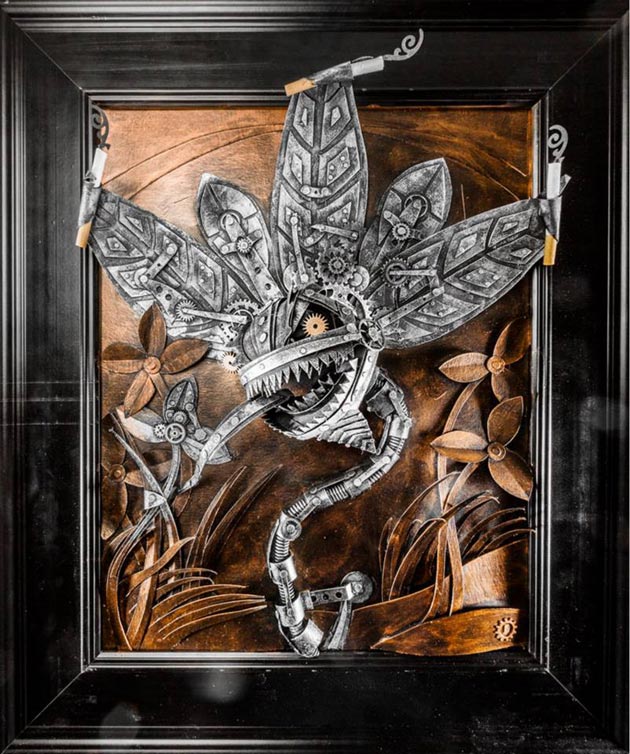 Njegova kolekcija sadrži osnovne tematske elemente steampunka, uključujući prisutnost mehaničke tehnologije spojene sa vintage estetikom – samo što, za razliku od klasičnih steampunk skulptura koje se obično prave od metala, on svoje pravi od kratona.