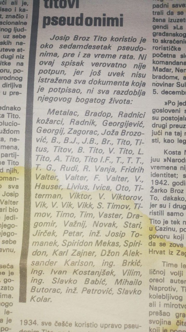 Autor ovih redaka, “bunarajući’ po arhivskim primjercima novina, pronašao je i požutjelo izdanje lista “Mladost” iz prošlog vijeka, i zanimljiv tekst o Titovim pseudonimima, koje je koristio dok je bio ilegalac.