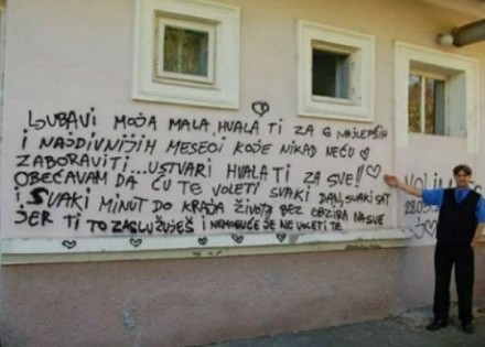 Jedan gospodin iz Srbije htio je da svojoj voljenoj kaže koliko mu znači i koliko je voli pa je od prijatelja dobio savjet da joj sve to napiše na zid, što je on to bukvalno shvatio. Naime, prijatelji su mislili da ostavi poruku na njenom “zidu” na Facebooku, ali je gospodin otišao i na zid zgrade ispisao prelijepu ljubavnu poruku.
