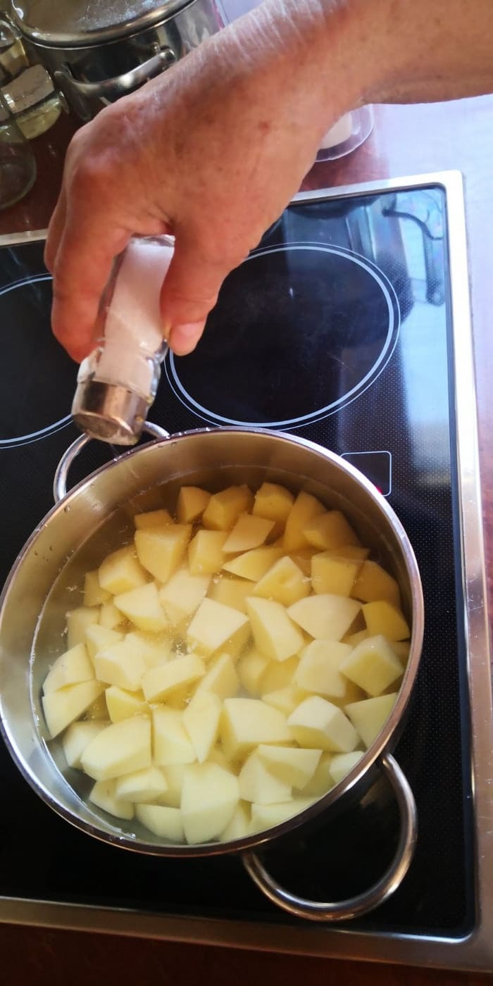 Odrezak možete poslužiti sa krompir salatom ili pekarskim krompirom. Mi smo odabrali krompir salatu zbog brže pripreme. Da bi krompir brzo skuhali, isjeckajte ga na kockice.