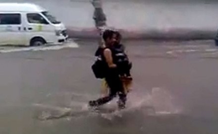 I pored vremenskih nepogoda i velikih poplava u meksičkom gradu Los Rejes romantika nije umrla. Tako je jedan mladić ponio svoju dragu, da ne ukvasi u noge. Ali su uspjeli da upadnu u šaht.