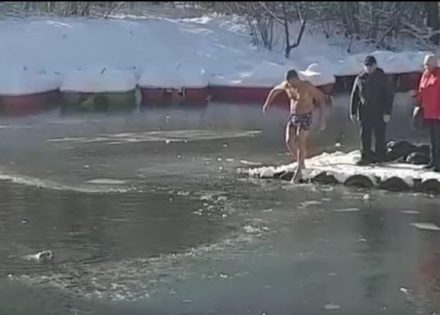 Kada je ovaj Rus shvatio da se nesrećni pas koprca u zamrznutom jezeru nije časio ni časa već je odmah počeo da skida garderobu kako bi ušao u vodu da ga izbavi. Pas nije mogao sam da priđe obali zbog leda koji se stegao i na koji nije mogao da se popne.