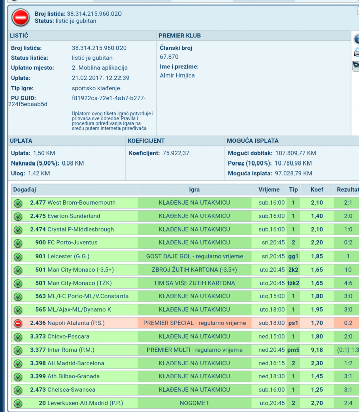 Vjerujemo da će se i iz kladionice “Premier” sjetiti ovog Sarajlije i ponuditi mu neku utješnu nagradu. Bilo bi lijepo, s obzirom da je riječ o studentu i njihovom stalnom igraču.
