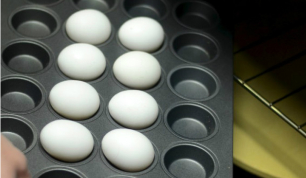 Uzmite pleh za mafine, stavite jaja sobne temperature unutra. Zagrijte rernu na 170 stepeni i pecite jaja tačno 30 minuta.