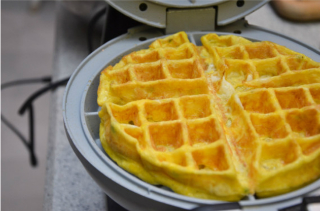 Umutite četiri jajeta, malo ljute papričice, isjeckajte mladi luk i dodajte jednu veliku supenu kašiku rendanog parmezana. Sve umutite da se fino sjedini i sipajte u aparat za vafle koji ste prethodno namastili.