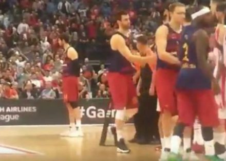 Dok je išla himna Evrolige, Delije su zapjevale iz sveg glasa, a igrači su stajali poređani. Međutim, igrači Barselone su poslije himne otišli da se pozdrave sa petorkom Zvezde, a Tomić je zabezeknut stajao sam na parketu.