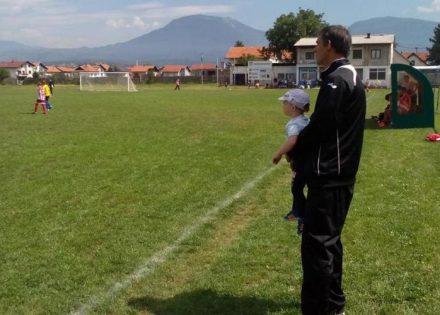Naime, trener Mesud Meka Duraković je prilikom utakmice lokalnog omladinskog kluba Globus meč posmatrao s unukom u naručju.