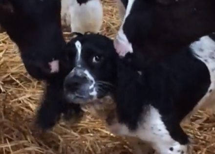 Video krava koje maze psa čija je dlaka iste crno-bijele boje kao i kod njih nasmijala je internet.