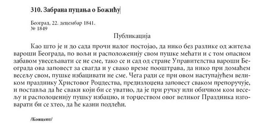 Vlast u Beogradu je 22. decembra 1841. godine uredila ovu rizičnu tradiciju na poseban način. “Zabranom pucanja o Božiću” naređeno je da se prestane sa navikom obilježavanja praznika, ovog i sličnih, pucanjem iz pušaka i pištolja.