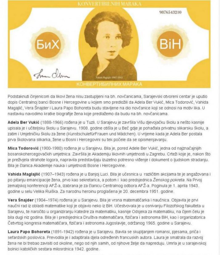Sarajevski otvoreni centar (SOC) uputio je dopis Centralnoj banci Bosne i Hercegovine u kojem je predloženo da Adela Ber Vukić, Mica Todorović, Vahida Maglajlić, Vera Šnajder i Laura Papo-Boherta budu stavljene na dio novčanice koji se odnosi na motiv lika.