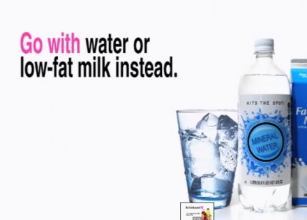 Na snimku se zatim pojavljuje tanjir pun masti sa porukom: “Uz unos od jedne limenke gaziranog pića dnevno, ugojićete se pet kilograma godišnje. Nemojte da se gojite pijući, izbacite gazirane sokove i druga zašećerena pića. Zamijenite ih vodom ili nemasnim mlijekom”.
